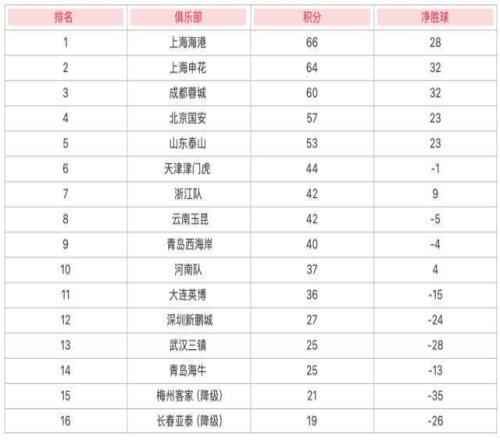 中超30轮积分榜:海港积66分夺冠梅州亚泰降级